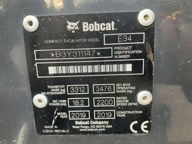 Minibagger Baujahr: 2019 Gewicht: 3.400 kg Betriebsstunden: 1.346 h Seriennummer: B3Y311147 Zustand: Ausgezeichnet Beschreibung: Gebrauchte Maschine in ausgezeichnetem Allgemeinzustand, einsatzbereit. Marke: Bobcat Modell: E34