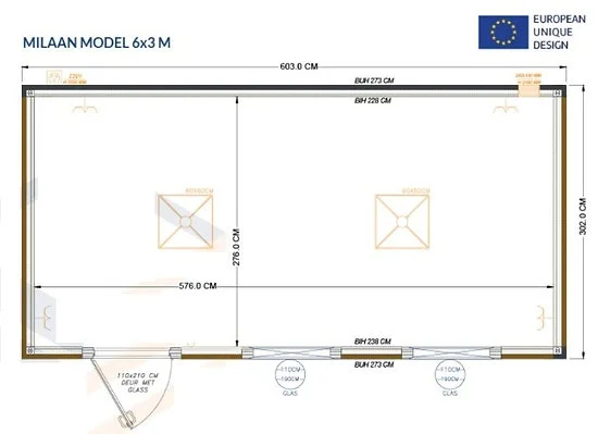 Das Modell Milan ist vollständig mit 100 mm expandiertem Polystyrol (EPS) an Wänden, Dach und Boden isoliert und bietet so hervorragenden Schutz vor klimatischen Schwankungen. Diese Hochleistungsdämmung sorgt für eine stabile Temperatur und ein angenehmes Raumklima, unabhängig von den Außenbedingungen. - Modernes und ästhetisches Design: